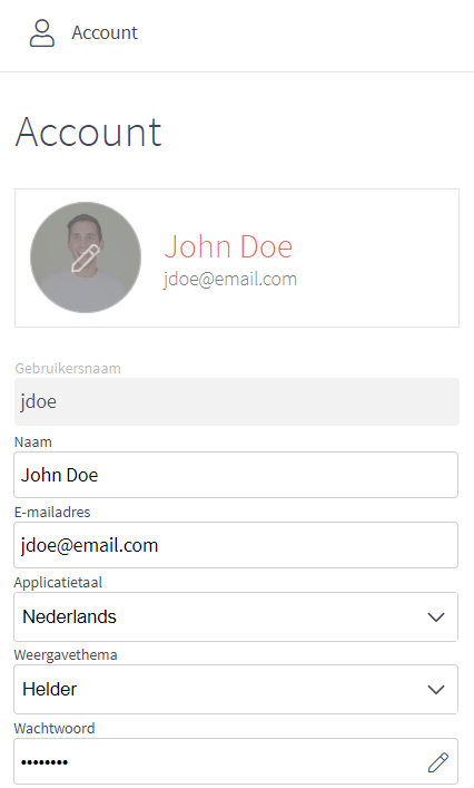 Hier kunt u uw profielfoto, naam, e-mailadres, taal, Weergavethema en wachtwoord instellen en/of bewerken. LET OP: Indien u met SSO ingelogd bent, kunt u hier niet uw wachtwoord aanpassen.