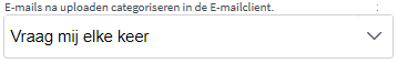 Indien binnen uw organisatie gebruik gemaakt wordt van Mailtool om bijvoorbeeld e-mails vanuit uw E-mailclient zoals Outlook automatisch te classificeren, kunt u hier ook aanpassen of u E-mails na uploaden direct wilt classificeren in uw mailclient. U heeft hier de keuze uit 'Altijd', 'Nooit', of 'Vraag mij elke keer'.