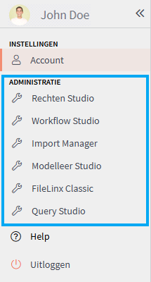 Als u applicatiebeheerder bent, heeft u onder het kopje “administratie” de mogelijkheid om direct naar de rechten studio, workflow studio, import manager, modelleer studio of de 2.9 homepage te gaan.