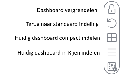 In het dashboard indelingsmenu rechtsonder in het scherm zijn ook een aantal opties beschikbaar. Zo kunt u de huidige indeling van uw dashboard vergrendelen zodat u niet ongewenst per ongeluk de indeling kunt wijzigen, kunt u terugkeren naar de standaard indeling van dit dashboard (wanneer deze beschikbaar is), en kunt u met één klik het dashboard compact- of in rijen indelen.