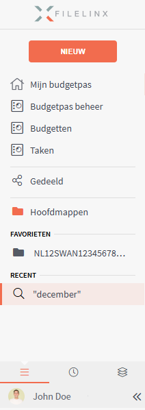 Zodra u ingelogd bent ziet u links in het hoofdmenu de "nieuw" knop, waarmee nieuwe items aangemaakt kunnen worden en een overzicht van uw dashboards, eventuele andere schermen zoals FileShare, de hoofdmappen, uw favorieten en recente zoekopdrachten. Ook kunt u via de pijltjes rechtsonder in het scherm het hoofdmenu inklappen, waarbij alle functionaliteiten beschikbaar blijven en u meer ruimte overhoudt om verder in de applicatie mee te werken.