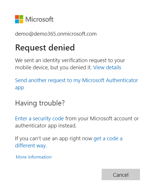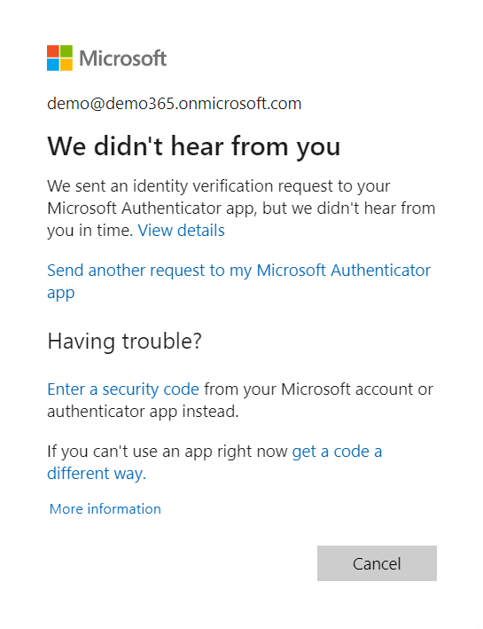 Als de gebruiker niet tijdig gereageerd heeft op het goedkeuringsverzoek dan zal Microsoft de volgende pagina tonen.