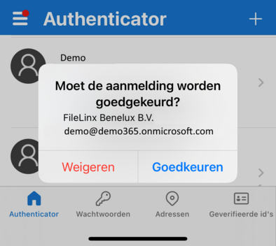 De gebruiker zal dan via de authenticator app goedkeuring moeten geven. Zoals in onderstaand scherm.