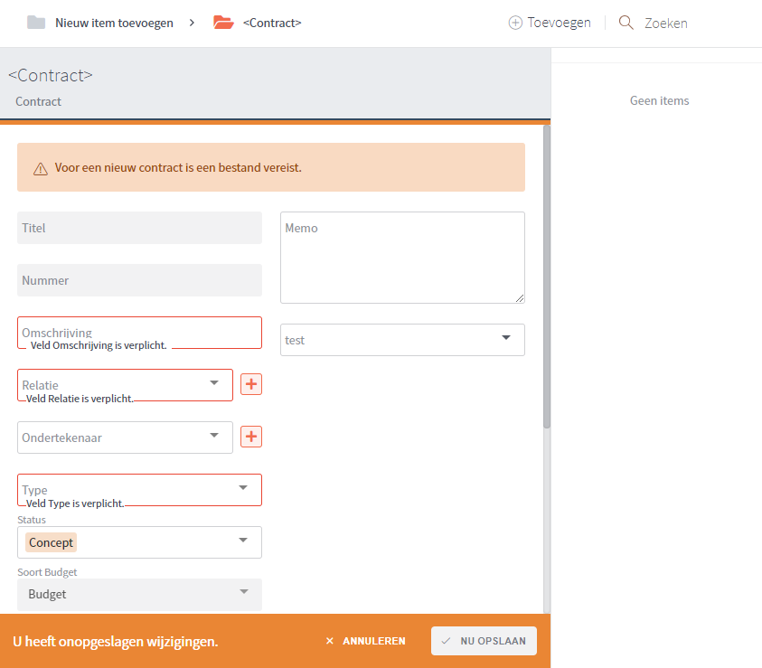 Klik op de "nieuw" knop links bovenin. Kies vervolgens een categorie waarin u het item wilt aanmaken.